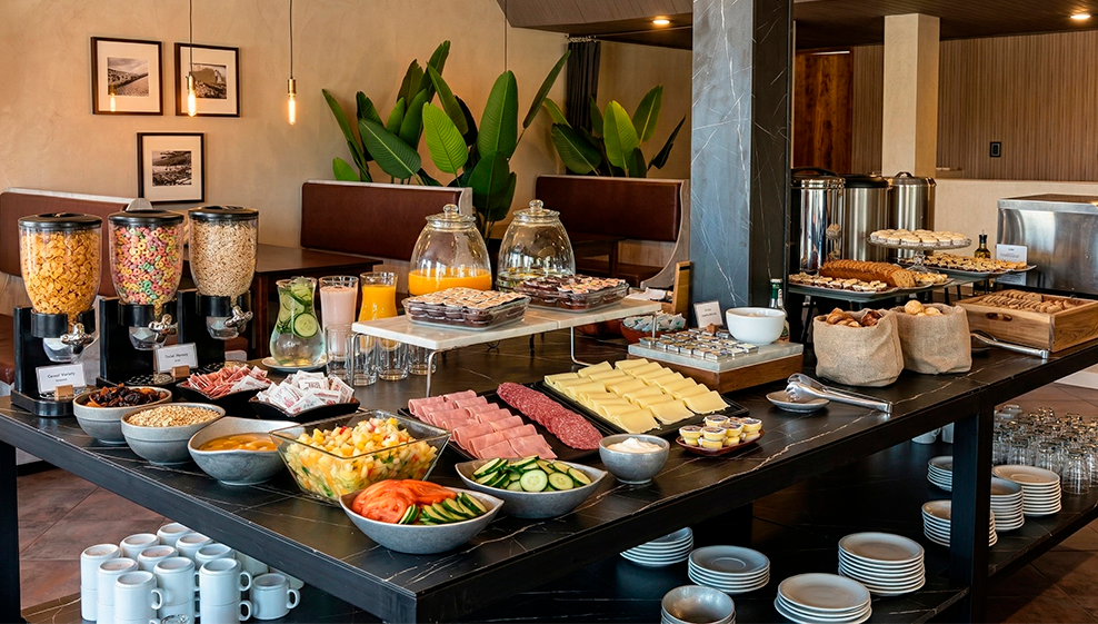 El desayuno buffet se sirve de 6:30 a 10:00. Incluye una variedad de infusiones, panificados, frutas de estación, cereales, huevos, embutidos, yogur y jugos naturales.